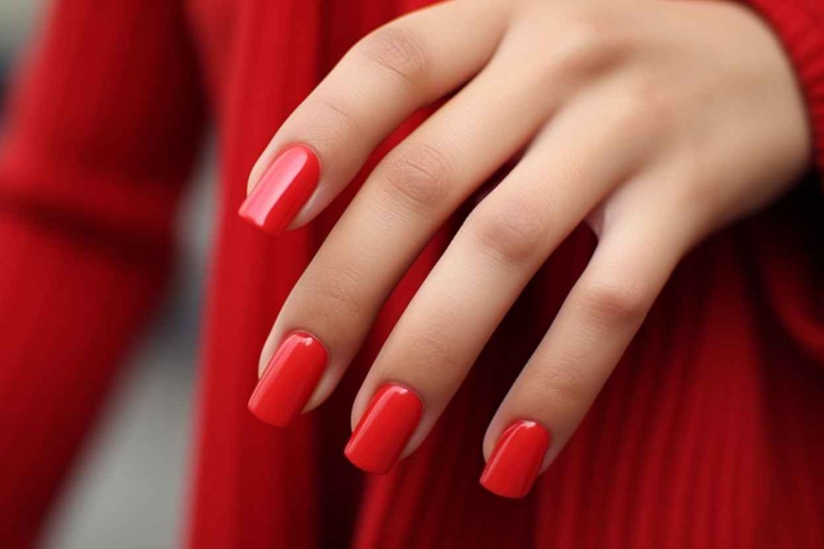 - Элегантно и универсально выглядит монохромный маникюр, при создании которого ногти равномерно покрывают лаком красного цвета.