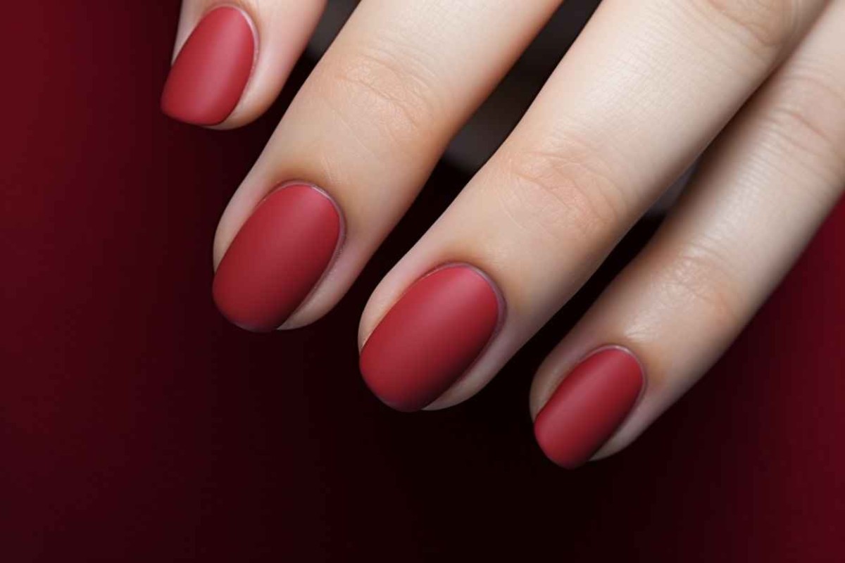 - Лаконичный вид ногтям придаст однотонное красное покрытие, имеющее матовую структуру.