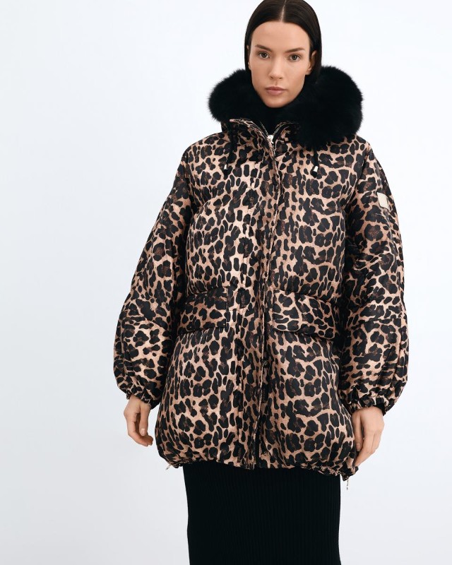 Ярко – не всегда про оттенки, акцент можно поставить с помощью принта. Обычно принты, особенно анималистичные, ассоциируются с шубами. Пуховик под зебру или леопарда – не самое популярное решение, поэтому выглядит так оригинально. Независимо от фасона, образ не будет слишком спортивным. Поэтому смело сочетайте его с брюками, костюмами с пиджаками, длинными трикотажными платьями, водолазками и рубашками (но только в монохроме, чтобы образ не выглядел слишком броско).
