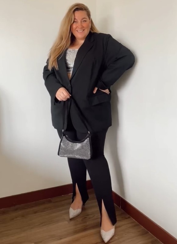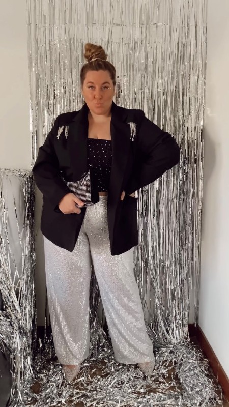Брюки в пайетках и минималистичный пиджак