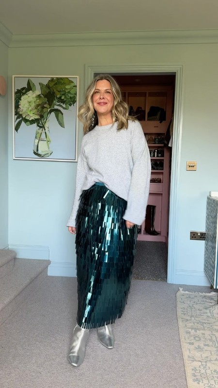 Пайетки – это не только про мини. Длинные юбки с прямоугольными пайетками эффектно переливаются при любом движении и выглядят невероятно стильно. Выбирайте глубокий зеленый или серебристый оттенок. Комбинируйте юбку со светлой блузой или лаконичной водолазкой, которая подчеркнет верхнюю часть тела. Многим девушкам plus size кажется, что такая юбка может "утяжелить", но это совсем не так. Вертикальные линии пайеток визуально вытягивают силуэт и создают гармоничные пропорции. Добавьте серебристые ботильоны – и готово!