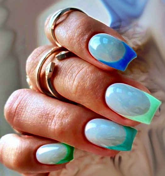- При создании френча предлагается обратиться к мятной, зелёной, изумрудной, синей цветовой гамме. «Улыбка» создаётся традиционной закруглённой формы либо делается в скошенном, двойном варианте.