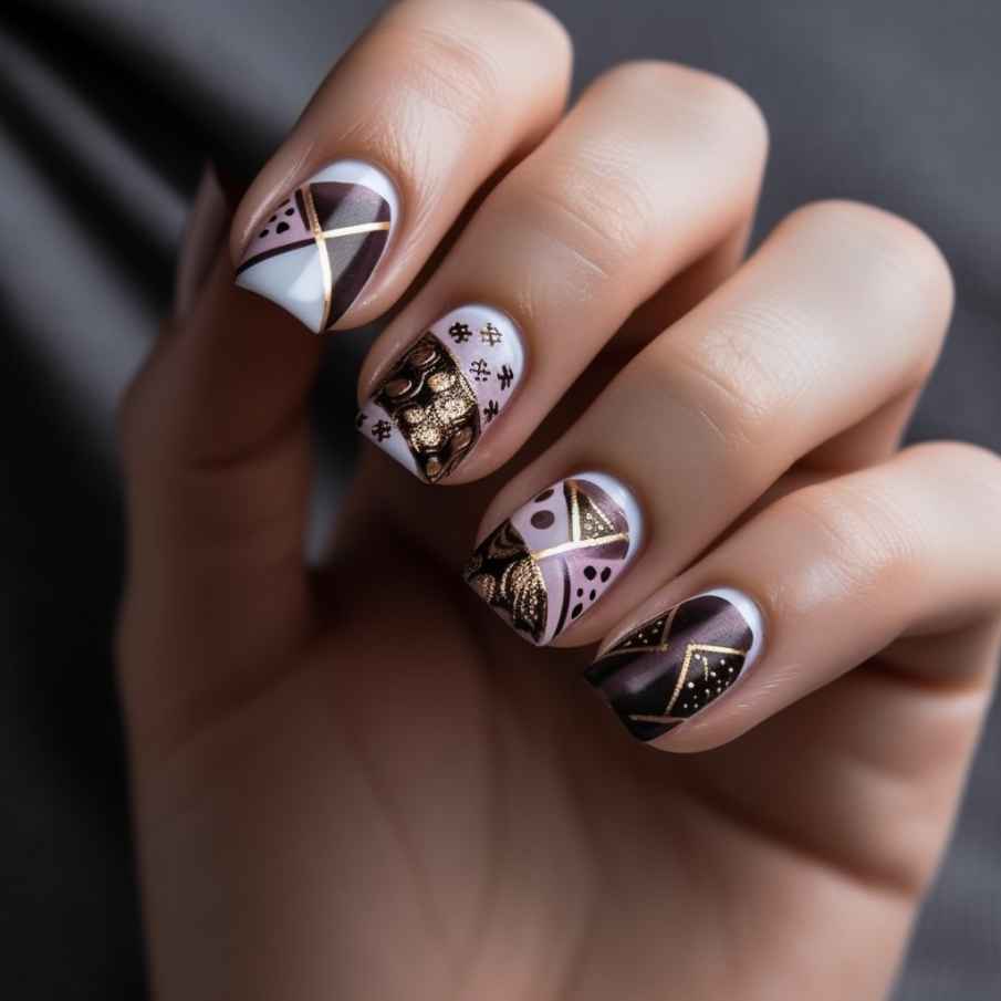 - При создании офисного осеннего маникюра беспроигрышным вариантом будет изобразить на ногтях геометрические фигуры. Они создаются в виде ромбов, квадратов, кругов, полос, заполняются лаком, блёстками либо камифубуки. Разрешается сделать рисунок путём обозначения тонкими контурными линиями, складывающимися в определённые фигуры.