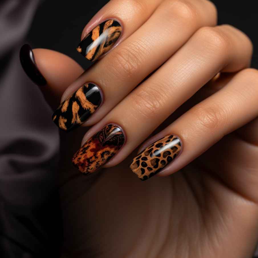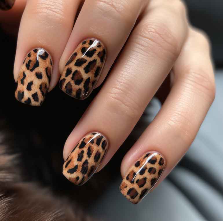 - Оригинальным решением станет нанесение на ногти принта, имитирующего расцветку леопарда или зебры. Для создания такого маникюра прибегают к подбору естественных тонов или ярким неоновым цветовым решениям.
