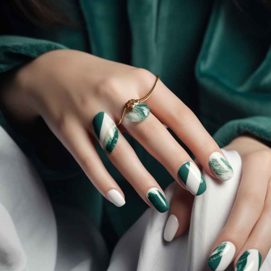- Освежающие нотки в образ привнесёт зелёный маникюр. Его разрешается сделать в блестящем варианте «кошачий глаз», окрасив ногти тёмным изумрудным лаком. Другой вариант – сделать френч, совместив нюдовую основу с яркой зелёной «улыбкой».