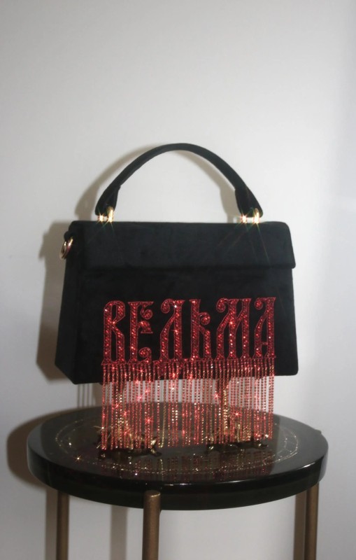 Сумки расшиты стразами, выложенными в надписи в стиле "Царевна", "Агент Кремля", "Дива Дивная". Если вам покажется этого мало, у бренда есть коронное изделие в коллекции – сумка на "курьих ножках" весом более двух килограмм, словно только что вышедшая из народных сказок.