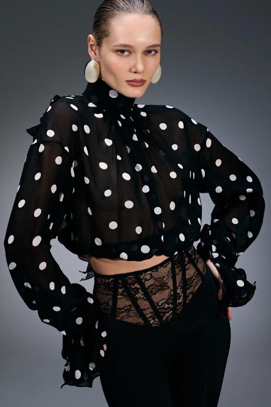 Если мелкий принт – это про деликатность, то крупный горох на прозрачном шифоне – это тренд. Такая блуза работает за счет контраста объемов и фактур. Невесомая ткань смягчает строгость узора и создает правильный баланс. Такой откровенный материал лучше всего наслаивать на базовые топы или лаконичное белье в тон. Гороховый принт сам по себе заменяет аксессуары, поэтому перегружать образ лишними деталями точно не стоит.