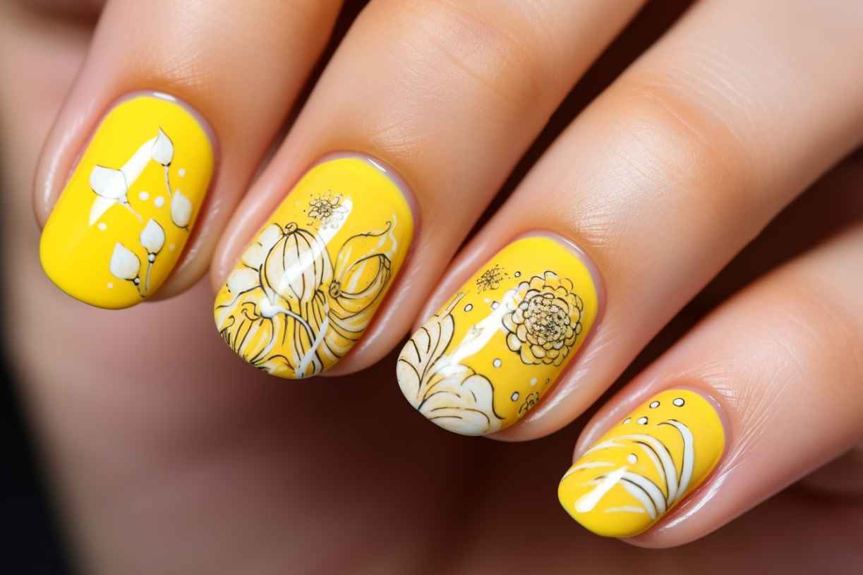 - Желтый цвет отлично подойдет для осеннего нейл-арта. Листья, выполненные в данном оттенке, можно совместить с аналогичными деталями в красном, оранжевом, шоколадном цветах.