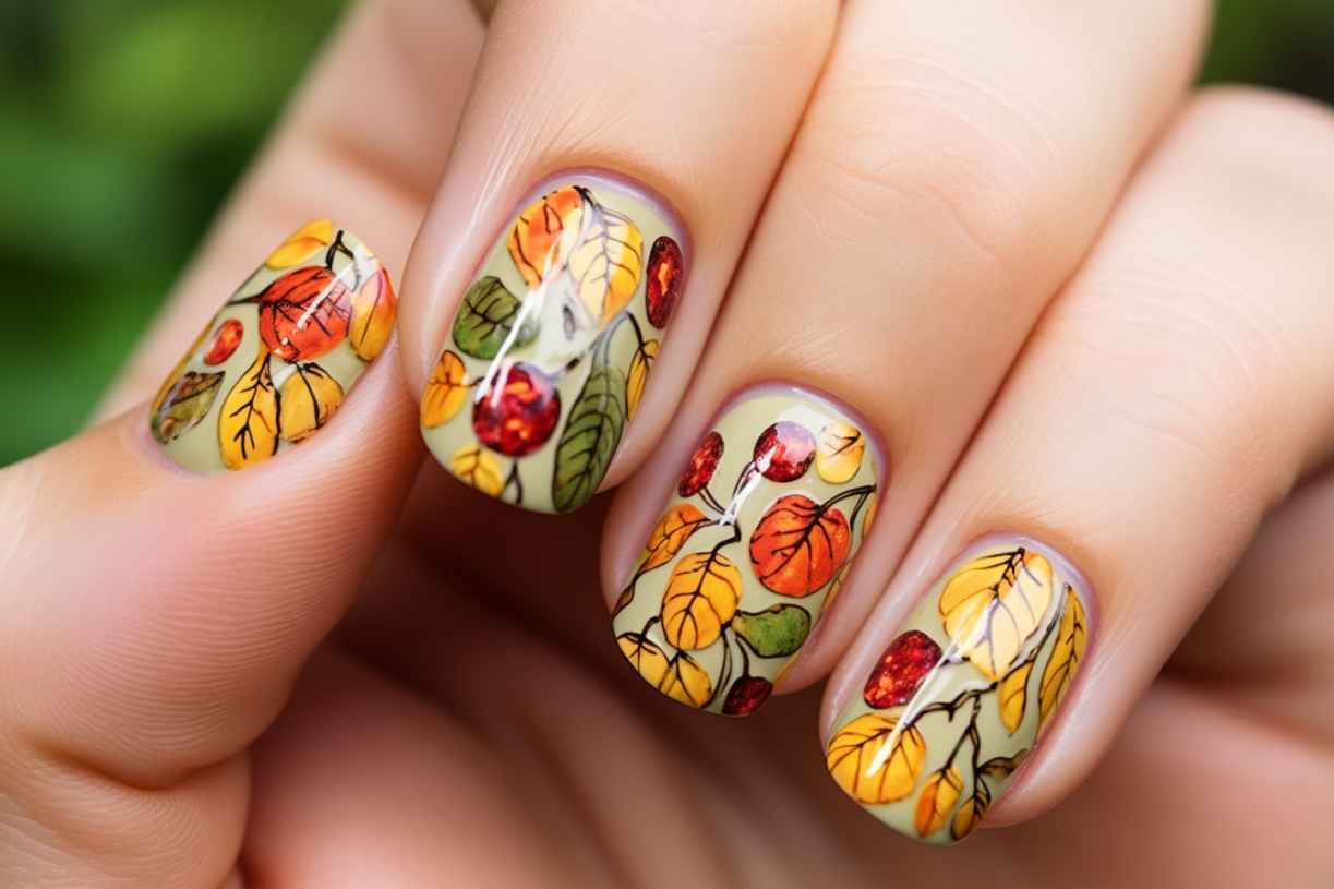 - Популярным решением для воплощения комбинации лаков разных оттенков на одной пластине станет нейл-дизайн, ассоциирующийся с фруктовой, растительной либо флористической тематикой. Эффект создается путем прорисовки цветочных лепестков, осенних листьев в разных оттенках. Примером яркого фруктового маникюра с комбинацией разных цветов станет нейл-арт, изображающий арбуз в разрезе с сочной розовой мякотью и зеленой корочкой.
