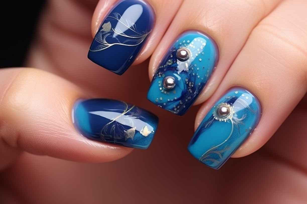 - Маникюр 2023 года, выполненный в насыщенном голубом цвете, гармонично вписывается в морскую тематику. Ногти покрывают однотонным блестящим глянцем или наносят на них полоски, чередующиеся в белоснежном и голубом цвете. Поверх можно нанести рисунок в виде якоря, штурвала в золотистом либо серебристом оттенке. Альтернативное решение – прибегнуть к объемному декору в виде ракушки или морской звезды.