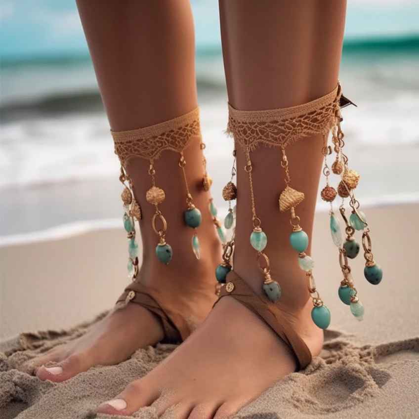 - Среди украшений лидирующие позиции продолжают занимать анклеты – браслеты, которые носят на ноге. Встречаются аксессуары, сделанные в виде изящной цепочки, или броские украшения, обильно декорированные камнями.