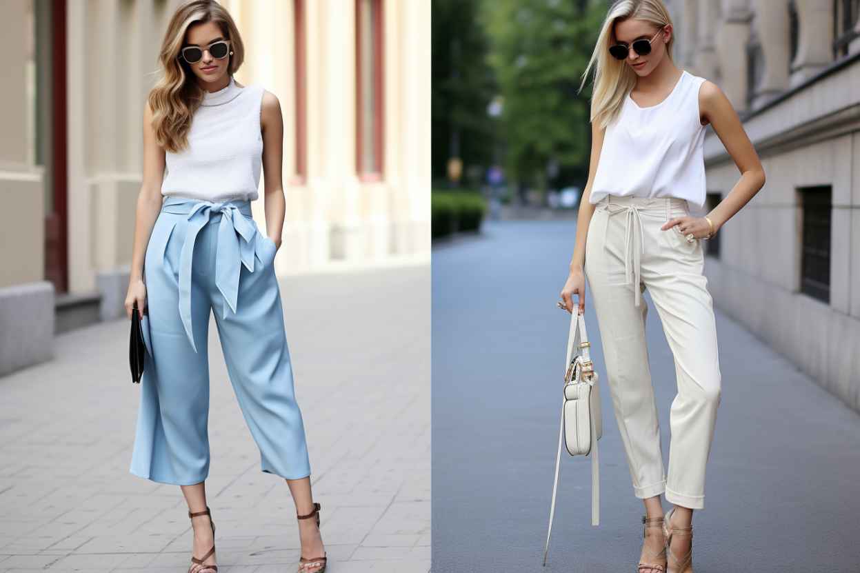 - Нейтральные оттенки, такие как бежевый и песочный, отлично подходят для летних брюк. Они универсальны и легко комбинируются с различным верхом и аксессуарами.