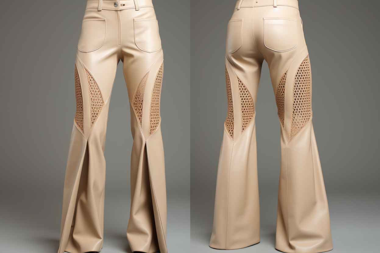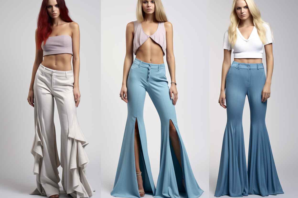- Расклешенные фасоны сделают образ женственным и романтичным. Расширение штанин начинается от области колена или бедра. Выигрышно смотрятся изделия, которым придается струящаяся структура. На лето 2023 года особенно актуальны модели, выполненные из шелка либо атласа.