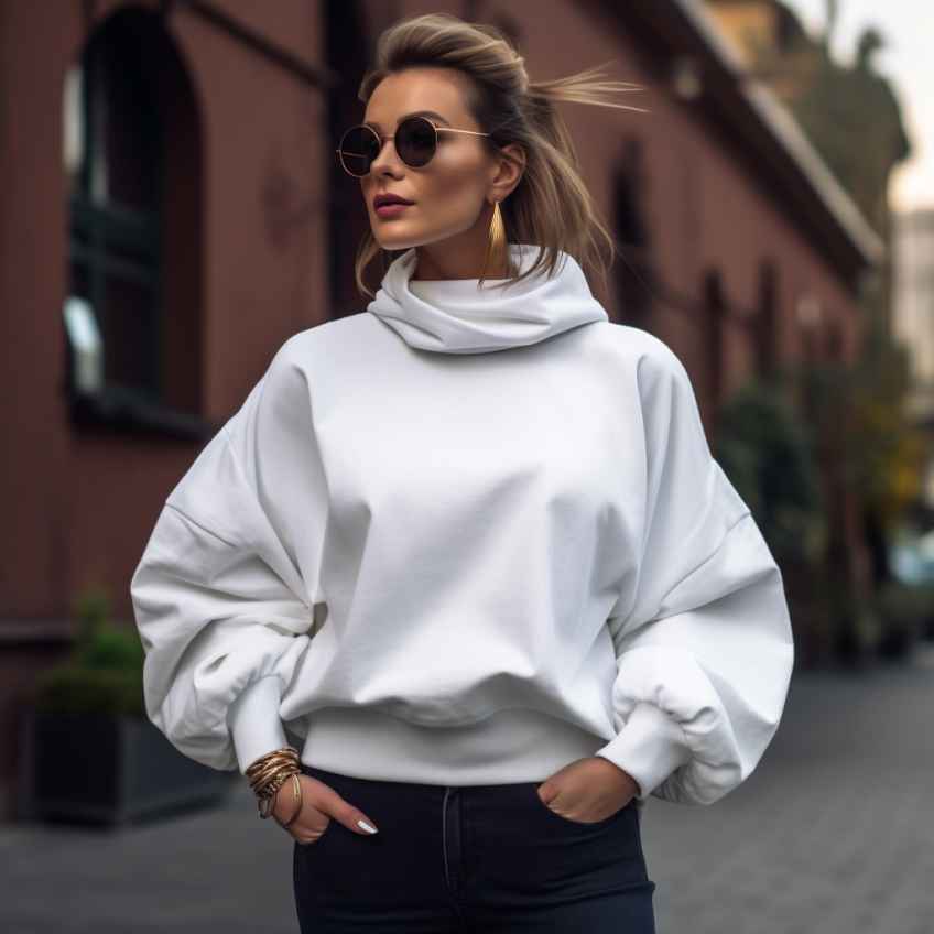- Оверсайз – этот фасон имеет очень широкий крой и создает ощущение вещи, снятой с чужого плеча. Оверсайз-кофты обеспечивают максимальный комфорт, их можно носить как с узкими, так и с широкими брюками или джинсами.