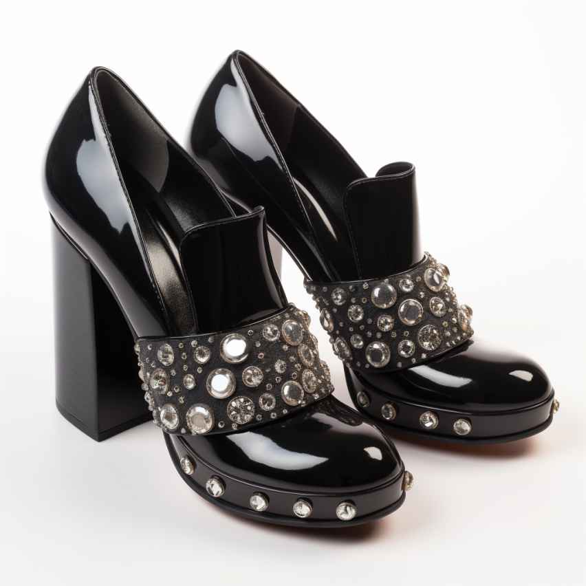 - Туфли с толстой подошвой и каблуком, которые поднимают ногу на несколько сантиметров. Нарядный вид придает украшение деталей мелкими переливающимися стразами.