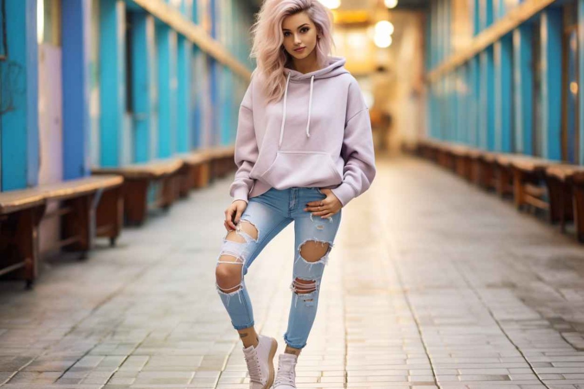 - Пастельное худи с объемным капюшоном можно совместить с дерзкими рваными джинсами. В качестве обуви возьмите кроссовки на массивной подошве или кеды-конверсы.