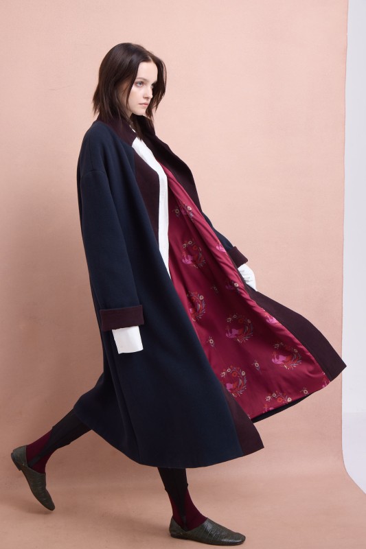 В осенне-зимней коллекции FRONT представил пальто, которые сконструированы по образцу армяка. В декор добавили бордовую отделку, а на подкладку – авторский принт с жар-птицей. Также в каталоге можно найти "татарское" платье из вискозы с авторским принтом, жилеты из винтажных платков и стеганые кафтаны.