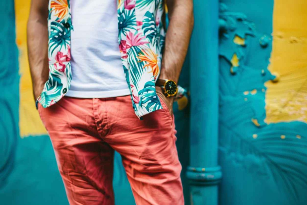 - Приветствуется сочетание ярких брюк, однотонной белой футболки и наброшенной поверх рубашки с принтами на тропическую тематику. Такой образ создает пляжное настроение, но предназначен для повседневных городских прогулок.