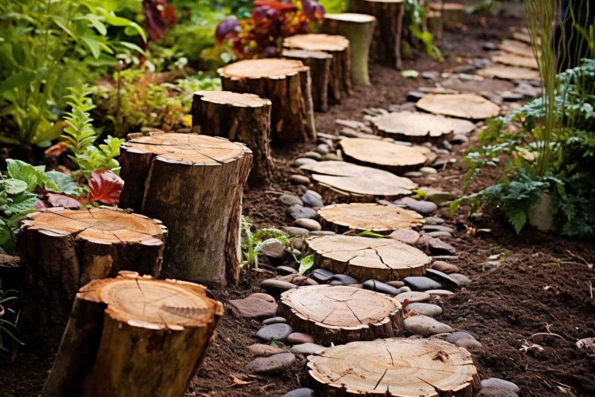 - Дорожка, выложенная из деревянных спилов, смотрится эстетично и эффектно. Кроме того, они очень функциональны. Пространство между спилами можно засыпать галькой или гравием.