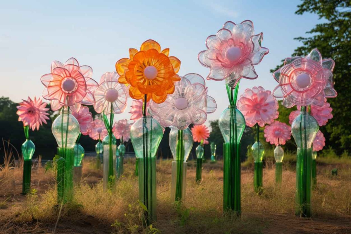 У многих после поездки на дачу собирается множество пластиковых бутылок, которые при желании можно применить с пользой. Очень интересно будет смотреться подвесная клумба, сделанная из бутылок, обрезанных наполовину и перевернутых книзу донышком. В них насыпают землю и высаживают яркие петунии или другие разновидности цветов.