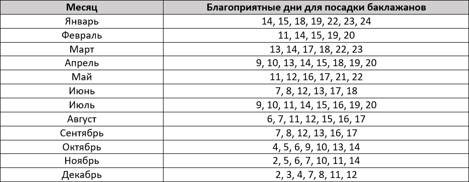 Учитывая особенности фаз лунного цикла и их влияние на растения, можно легко определить благоприятные дни для посадки баклажанов в 2024 году. Рекомендации представлены в таблице ниже: