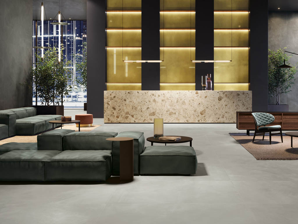 Крупноформатный керамогранит с насыщенной графикой способен привнести в оформление особую атмосферу. Например, модели из коллекции КОНТИНУУМ российской компании Italon обеспечат во внутреннем пространстве частного или коммерческого характера впечатляющее своей реалистичностью и выразительностью средств украшение. Ректифицированная плитка 120х278 см и 80х160 см серого и бежевого оттенка словно состоит из агломератов мелкой, средней и крупной фракций, с первого взгляда концентрирующая на себе внимание в дизайне. Отличный способ, чтобы выделить вертикальную или горизонтальную поверхность, обеспечив ей при этом долговечность и практичность в ежедневном использовании.