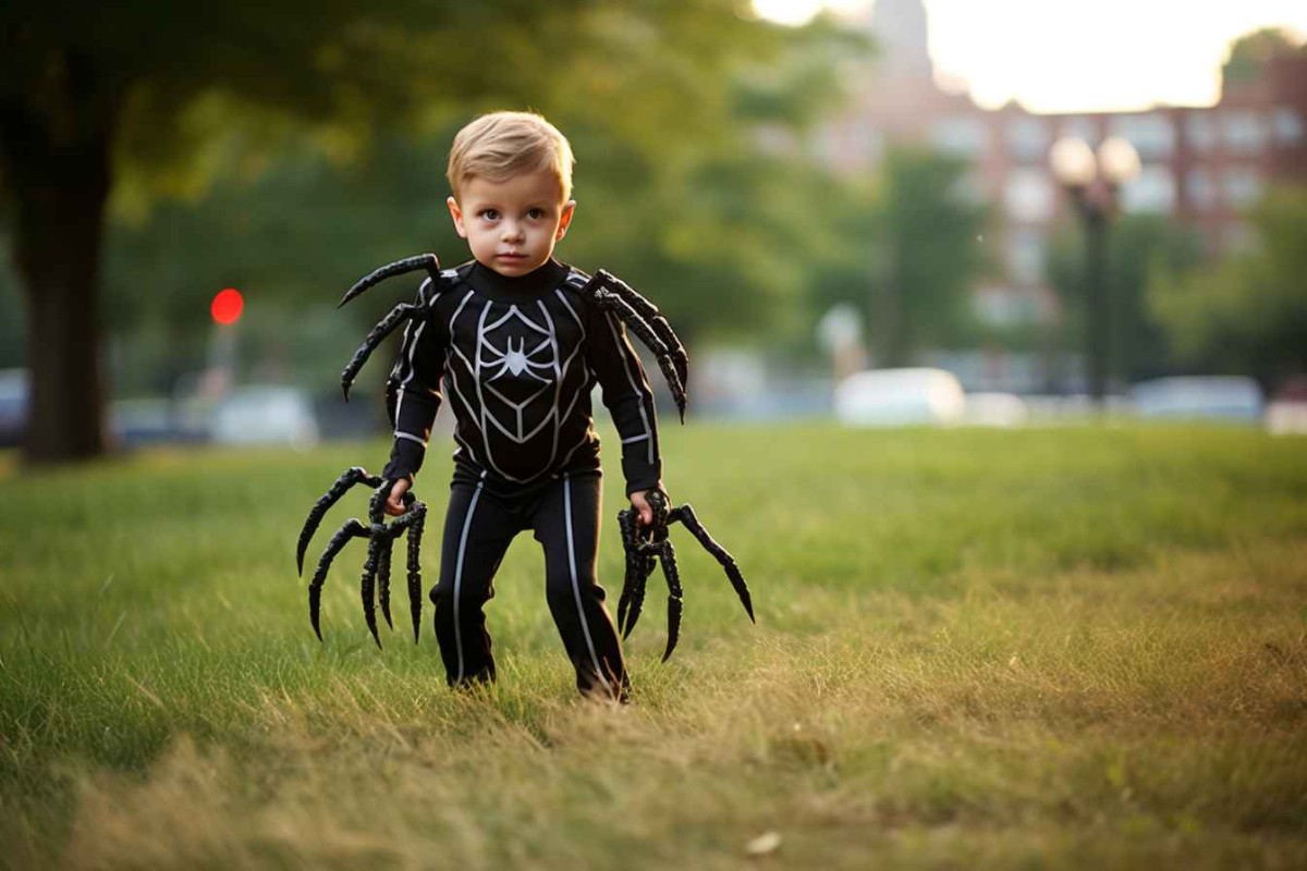 - Создайте паучьи ноги, используя эластичный материал. Вырежьте нужное количество "ног" и пришейте их к нижней части брюк или комбинезона.