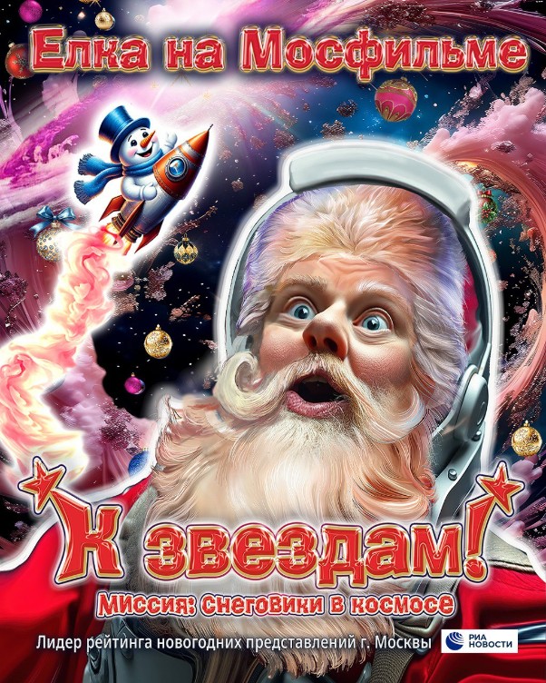 В год 130-летия российского кинематографа на "Мосфильме" состоится ежегодная "Киноелка" для всей семьи, которая в этом сезоне получила название "К Звездам! Миссия: Снеговики в Космосе". В основе сюжета шоу – межгалактическое приключение помощников Деда Мороза, которым подвластны любые испытания. Снеговики и их верные друзья – Кнопка, Соловей, Стрекоза, Пчелка, Пингвины и Муравей отправятся за звездой с небес, исполняющей все детские желания на Земле.
