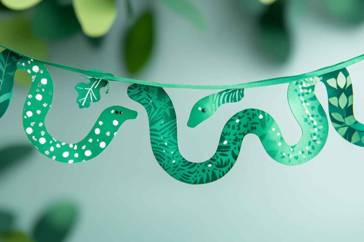 Гирлянда с символом года – Зеленой Деревянной Змеей. Вырежьте из зеленой бумаги силуэты змей, украсьте их узорами и блестками. Прикрепите змей к нитке или ленте.