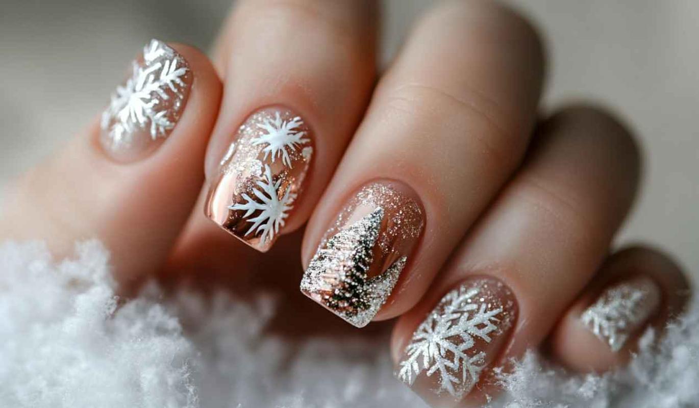 Снежинки – традиционный символ зимних праздников, который всегда актуален. На коротких ногтях можно использовать тонкие линии и минималистичные узоры, изображающие снежинки, чтобы маникюр не выглядел перегруженным. Идеально подойдет серебряный или белый рисунок на фоне тёмно-синего или бордового лака.