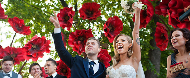 Влад и Рита сочетались браком на прошлой неделе, а в понедельник, 8 июня, устроили роскошный свадебный банкет. На организацию специальной тематической вечеринки у пары ушло четыре месяца. В качестве концепции влюбленные выбрали гангстерскую тематику, поэтому, кроме белого шатра, столов, утопающих в нежных цветах, и классического пышного платья невесты, традиционных свадебных атрибутов на празднике не было. Преимущественно карты, шляпы, револьверы и перья - все как в любимом фильме молодоженов «Однажды в Америке». Даже на ковровой дорожке, по которой собравшимся предстояло пройти к месту банкета, вместо лепестков роз была россыпь игральных карт.