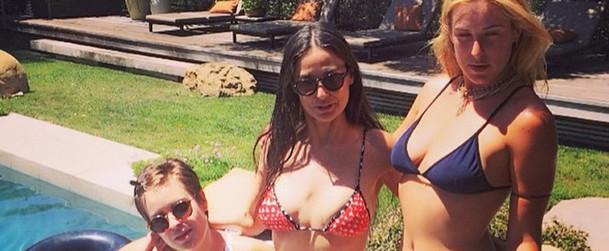 Дочь Деми Таллула (Tallulah) опубликовала на днях в Instagram милый семейный снимок. На фотографии Деми позирует в бикини вместе с Таллулой и Скаут в бассейне. Судя по снимку, 52-летняя актриса не позволяет себе расслабляться, и ее фигуре могут позавидовать даже девушки лет на 20 моложе.