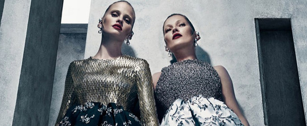 Компанию Кейт на съемочной площадке составила нидерландская топ-модель Лара Стоун (Lara Stone). И нельзя не признать, что получился весьма впечатляющий тандем: дамы позировали с одинаковыми прическами и макияжем, но в разных нарядах, что выглядело очень эффектно. Фотосессию проводил знаменитый фотограф Стивен Кляйн (Steven Klein).