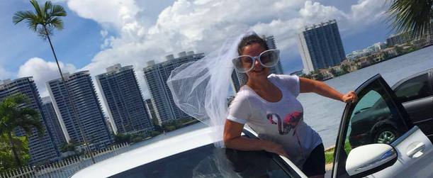 Здесь были все атрибуты настоящей свадьбы: белоснежный Мерседес с надписью «Новобрачные», невеста в фате. Правда, белому платью Наташа Королева предпочла футболку с принтом в виде розового фламинго.