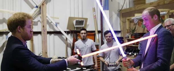 Кто из парней не мечтал хотя бы покрутить настоящим световым мечом? Принцам Уильяму (William) и Гарри (Harry) повезло. Накануне они устроили битву на самых настоящих световых мечах на самой настоящей съемочной площадке киносаги «Звездные войны». А еще Гарри душевно пообщался с Чубаккой.