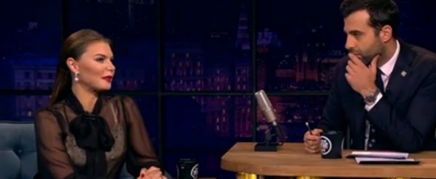 Во время беседы с Иваном Кабаева мило улыбалась и шутила. Ургант не преминул заметить, что Алина Маратовна фактически является его начальником – сейчас Кабаева занимает пост председателя совета директоров Национальной Медиагруппы, в состав которой входит Первый канал. Гимнастка оценила шутку Урганта, но предпочла не акцентировать на ней внимание.
