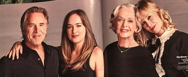 Звездную троицу дополнила голливудская легенда Типпи Хедрен (Tippi Hedren), мать Мелани. Звезды снялись для специального разворота об актерских династиях. Все четверо были одеты в черное для семейного снимка.