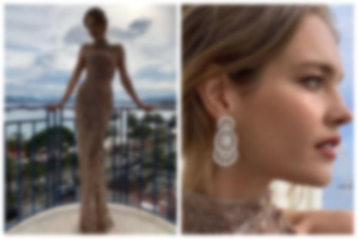 В качестве украшений модель предпочла надеть крупные серьги с ажурным узором и браслет. Драгоценности были инкрустированы настоящими бриллиантами, но при этом громоздко и слишком вычурно не смотрелись.