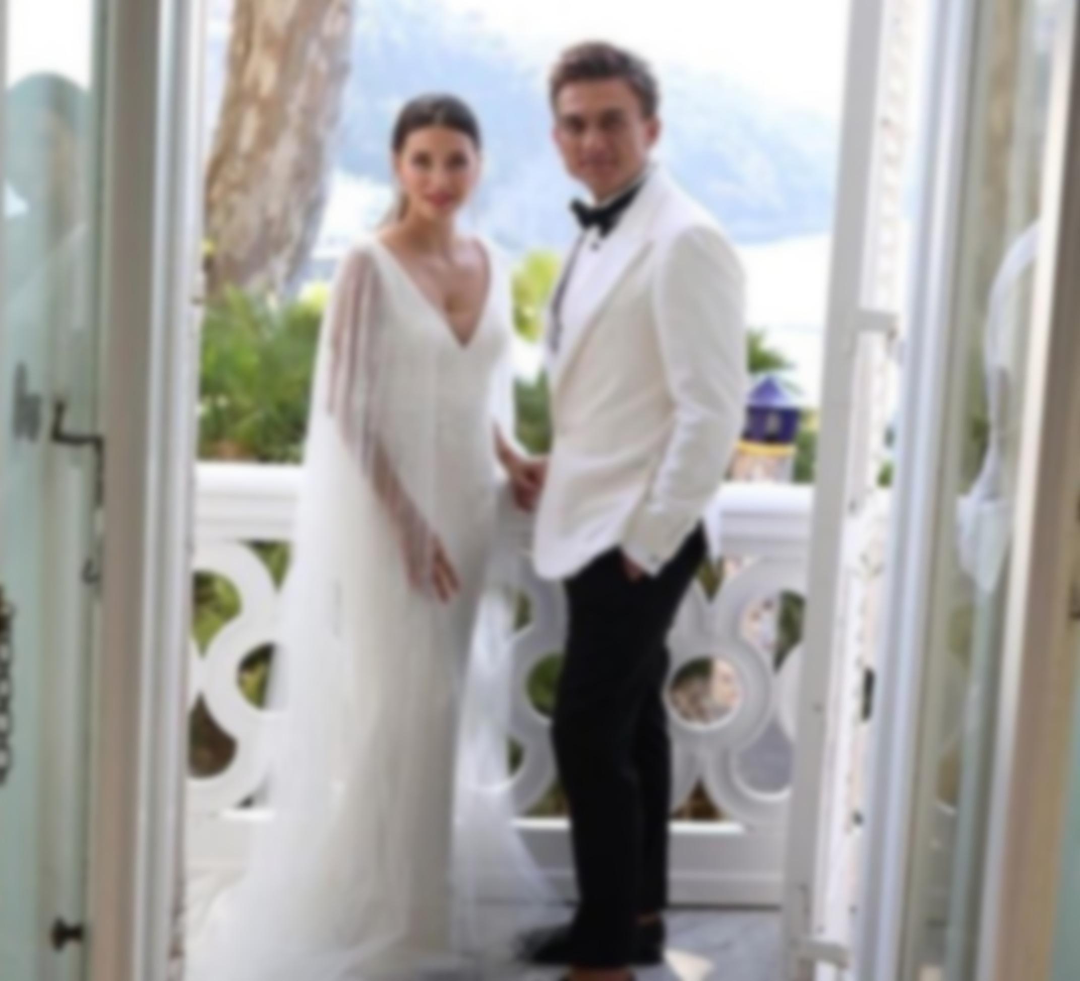 Для торжества невеста выбрала элегантное белое платье с вшитой полупрозрачной накидкой. Топалов надел черно-белый костюм.