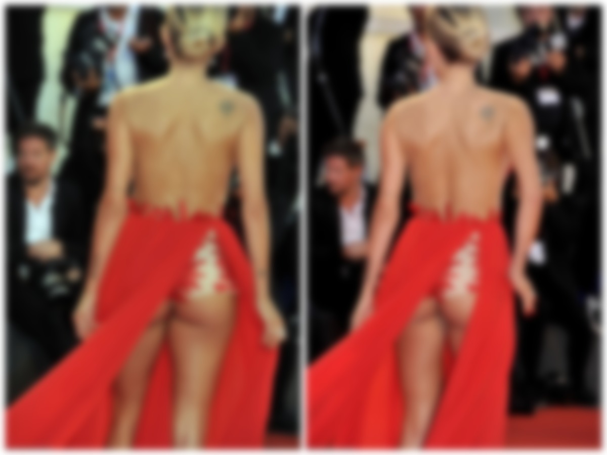 Дойдя до точки, на которой все звезды позировали фотографам, Людовика скинула с себя накидку. Когда она стала поправлять юбку, оказалось, что разрезы расположены не только впереди, но и сзади. Они оказались такими же высокими и полностью обнажили ягодицы дамочки.