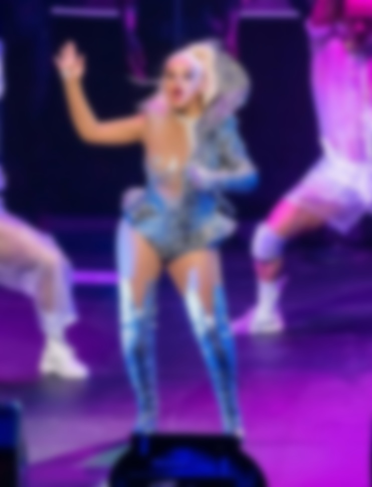 Например, на концерте в Дублине Кристина надела боди телесного цвета, расшитое стразами. Тон наряда был подобран строго в соответствии с оттенком кожи артистки, из-за чего создавалась иллюзия обнаженного тела. Полные ноги звезда подчеркнула облегающими ботфортами.