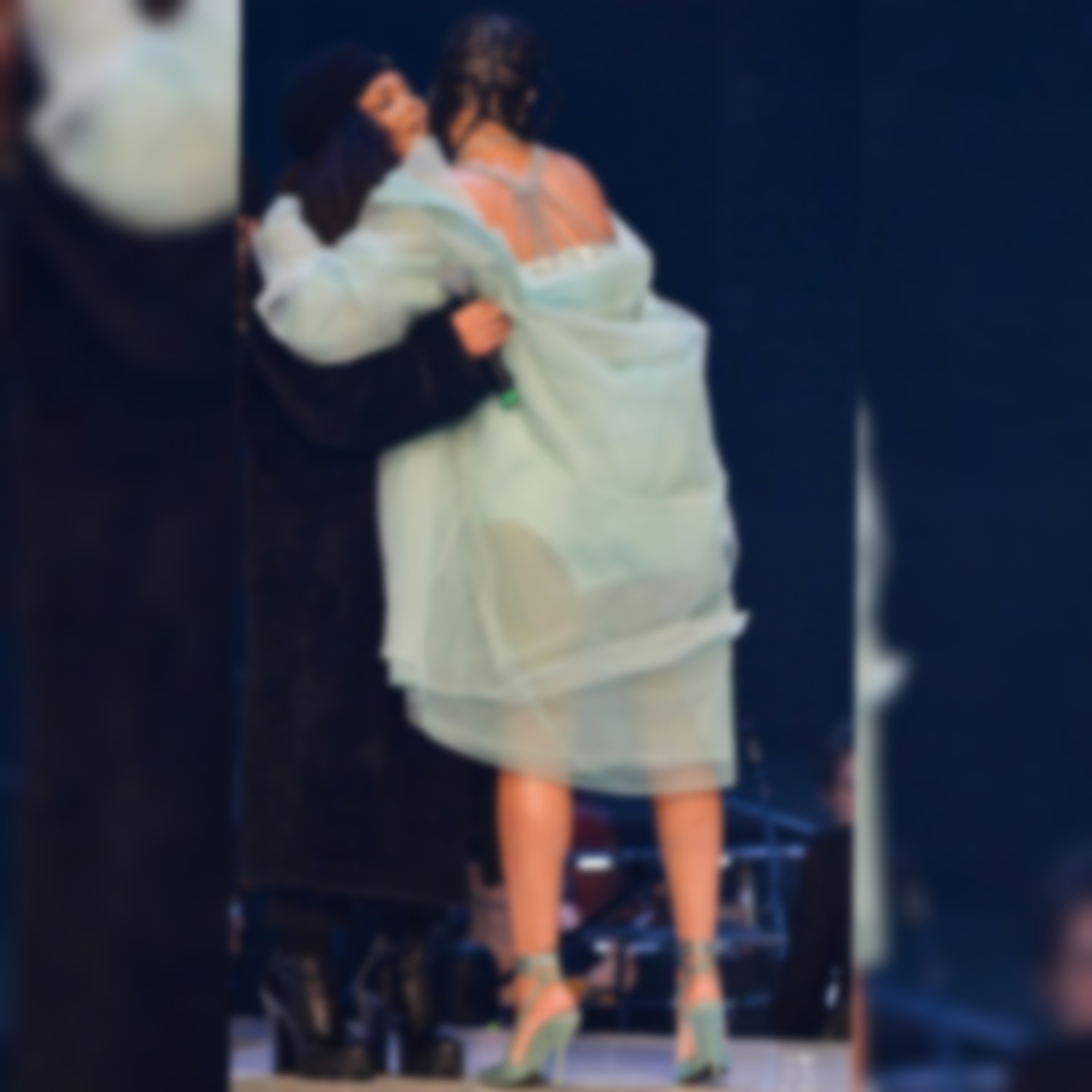 Образ певицы, несмотря на дерзкое мини и глубокое декольте, смотрелся целомудренно, но до тех пор, пока она не повернулась к камерам спиной. Оказалось, что вырезы по бокам настолько большие, что полностью обнажают бедра артистки. Так, что накидка здесь была не только частью образа, но и вполне практичной деталью, не позволившей звезде засветить ягодицы.