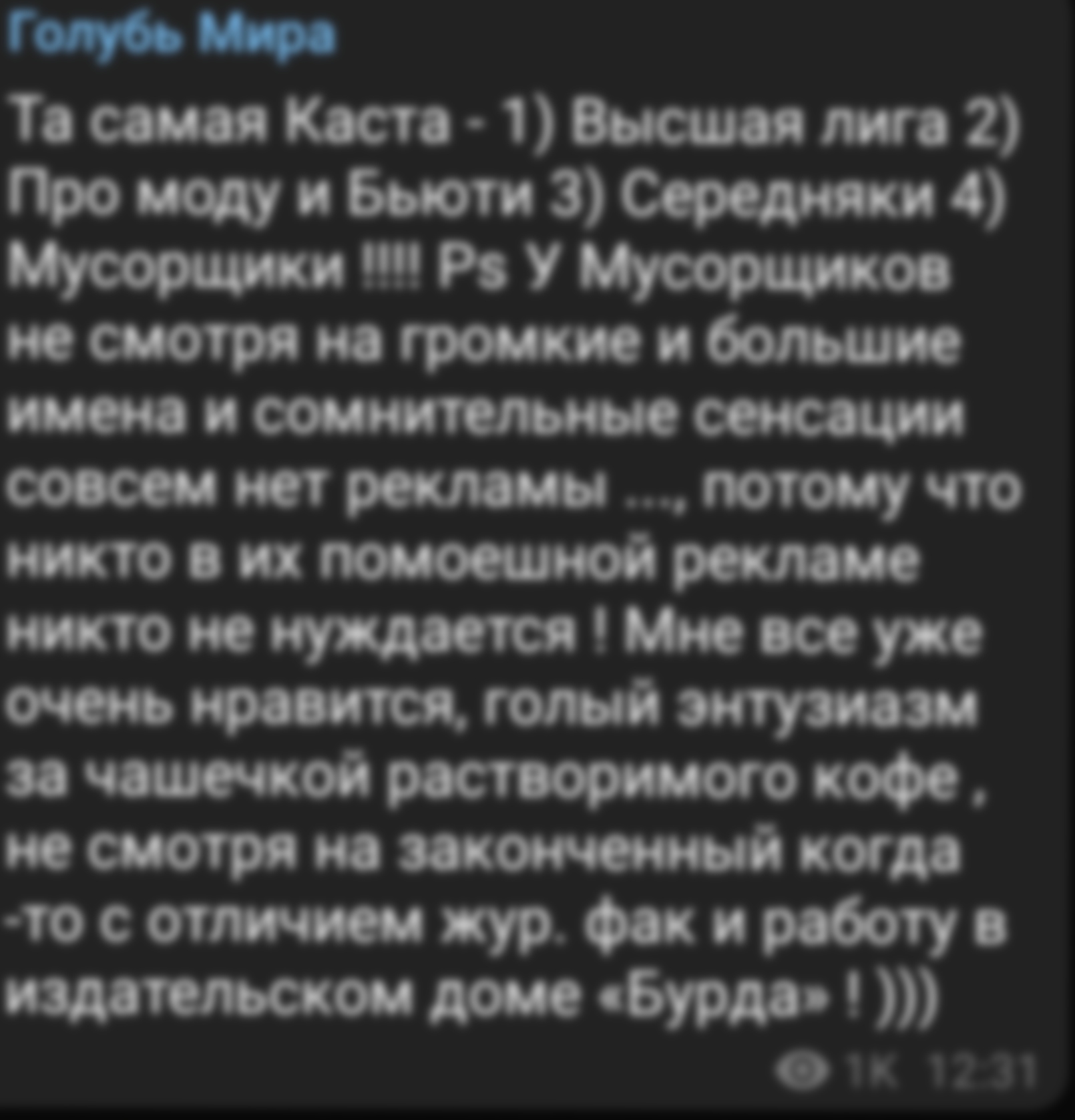 Позже, пообщавшись с авторами других каналов, Яна заявила, что весь Телеграм делится сразу на несколько каст. Это «Высшая лига», в которую входят все ее друзья, информационные площадки про моду и индустрию красоты, середнячки, а также мусорщики. К мусорщикам Рудковская отнеслась с презрением.