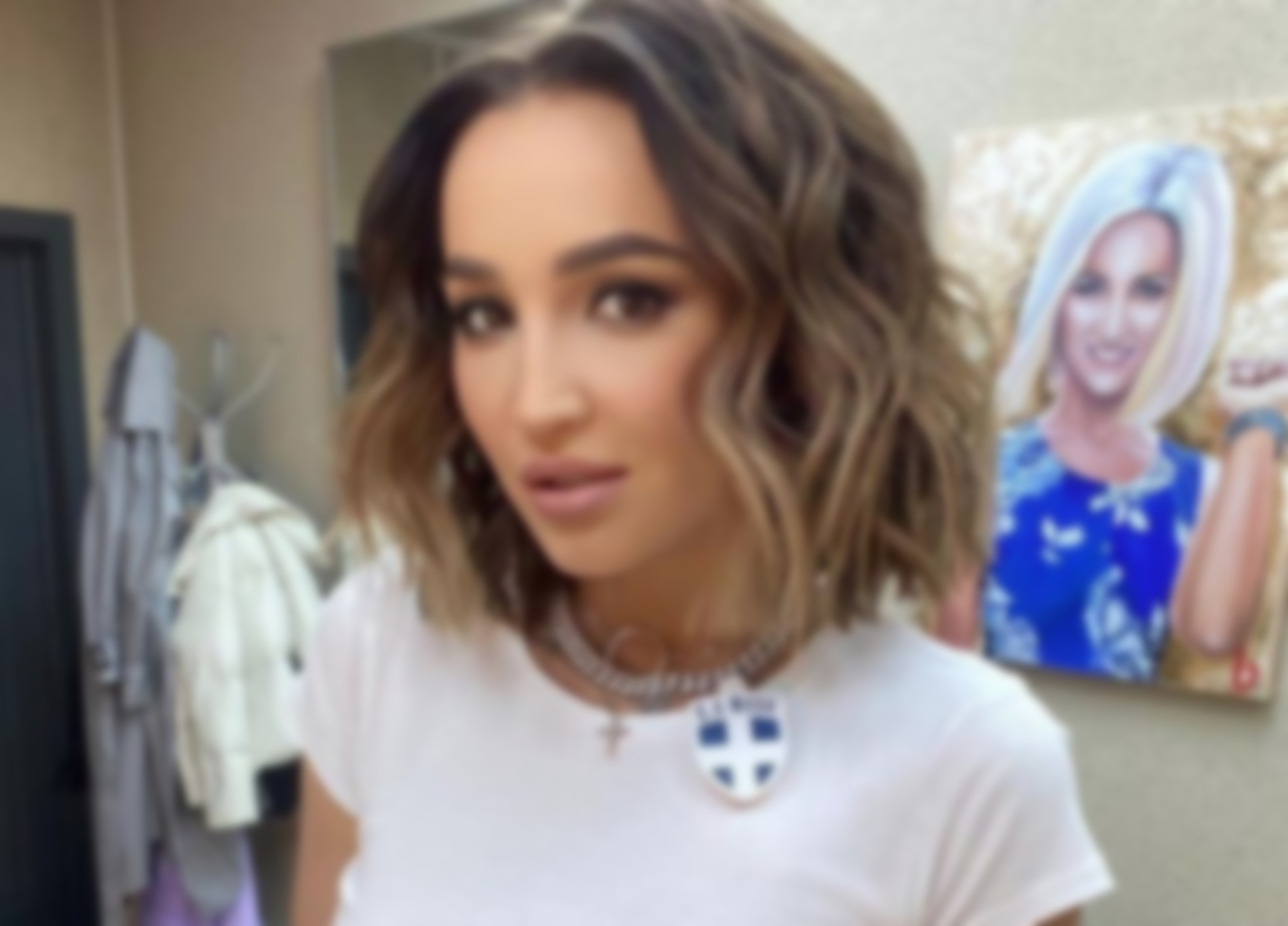 Девушка оделась просто и модно одновременно. Она предпочла брючный костюм песочного цвета с укороченным жакетом. Под него телеведущая надела простой черный топ. Ярким акцентом лука стала массивная золотая цепь на шее.