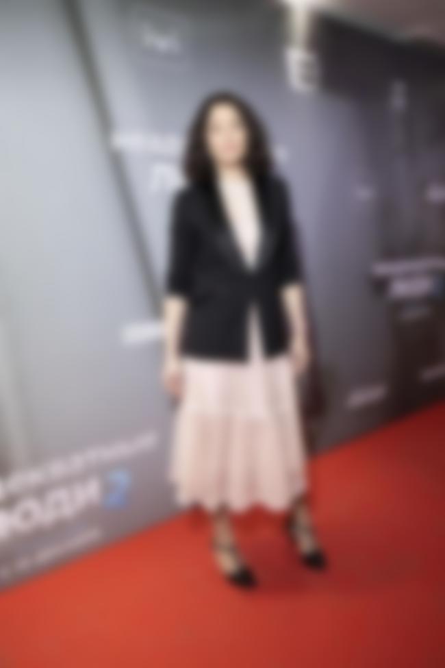 Безупречным стилем поразила Екатерина Волкова, которая выбрала нежно-розовое воздушное платье, выполненное из шифона, и дополнила его черным пиджаком-смокингом.