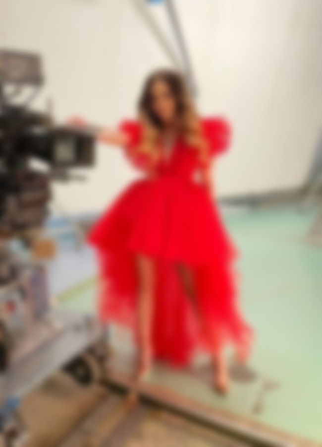 Роскошное воздушное красное платье она совместила с уютными домашними плюшевыми тапочками. Этому нашлось простое объяснение – между съемками Ольге приходится передвигаться по длинным коридорам, а делать это на шпильках очень неудобно.