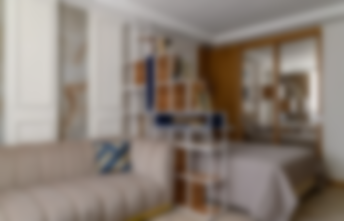 Из длинной и узкой комнаты дизайнеры сделали спальню и гостиную. Они разбили помещение зонально с помощью стеллажа.
