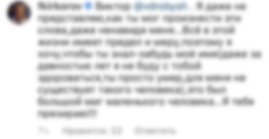 «Виктор Дробыш. Я даже не представляю, как ты мог произнести эти слова, даже ненавидя меня… Все в этой жизни имеет предел и меру, поэтому я хочу, чтобы ты знал, – забудь мое имя (даже за давностью лет я не буду с тобой здороваться, ты просто умер, для меня не существует такого человека), это был большой миг маленького человека… Я тебя презираю!» – ответил Киркоров.