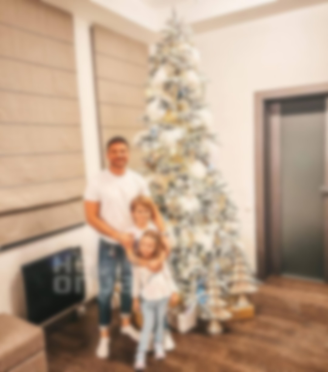 Знаменитый артист Сергей Лазарев тоже похвастался своей елкой-красавицей. Она будто припорошена настоящим белым снегом и украшена игрушками. Под искусственным деревом стоят золотистые небольшие фигурки и лежат красивые подарочные коробки. Рядом с артистом стоят в обнимку его любимые дети: Никита и Аня.