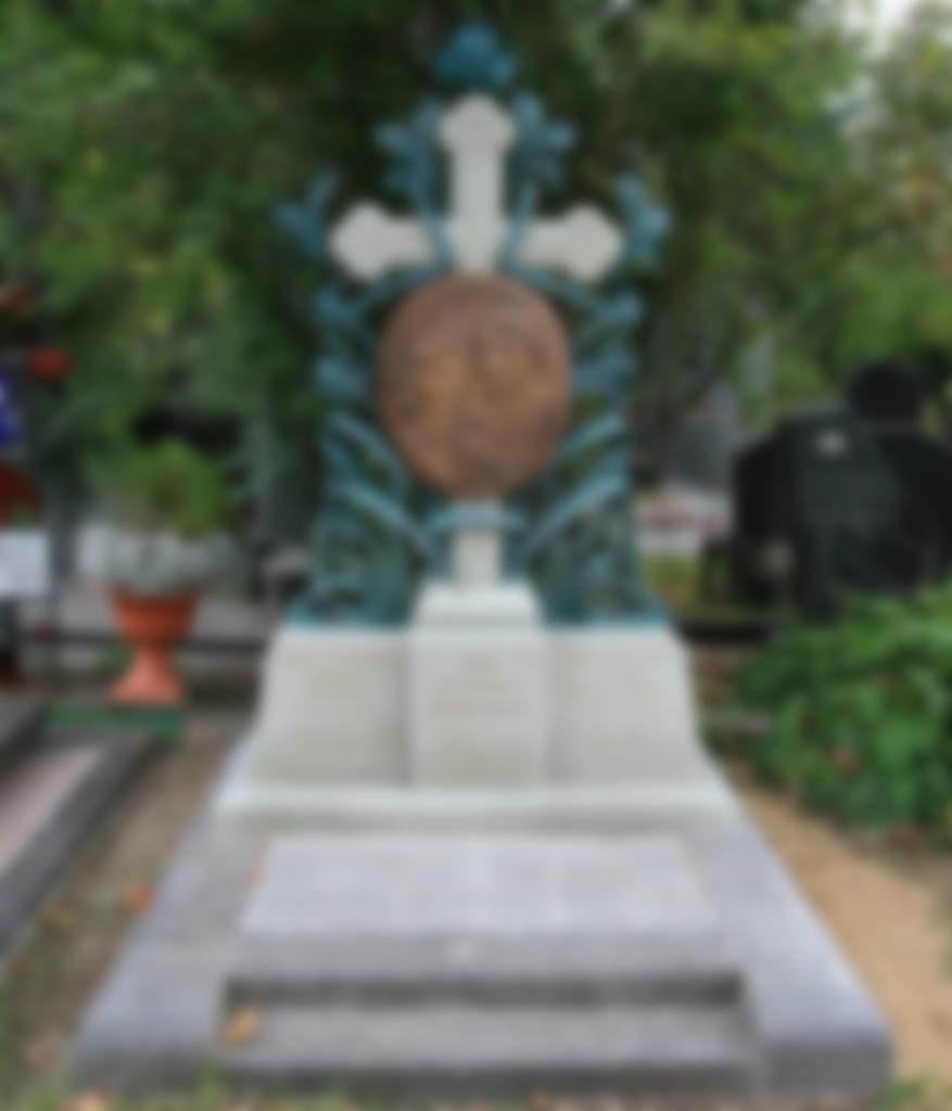 Надгробие представляет собой композицию из светлого камня. Сверху – витиеватая зеленая решетка, красивый крест из белого мрамора и выбитый в металле совместный портрет. Снизу, золотистыми буквами на белом камне выведены имена покойных, посередине трогательная запись: «Любовь не подвержена действию времени».